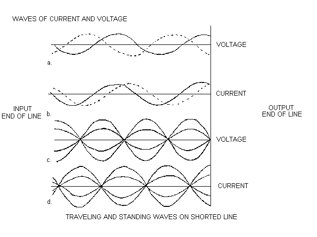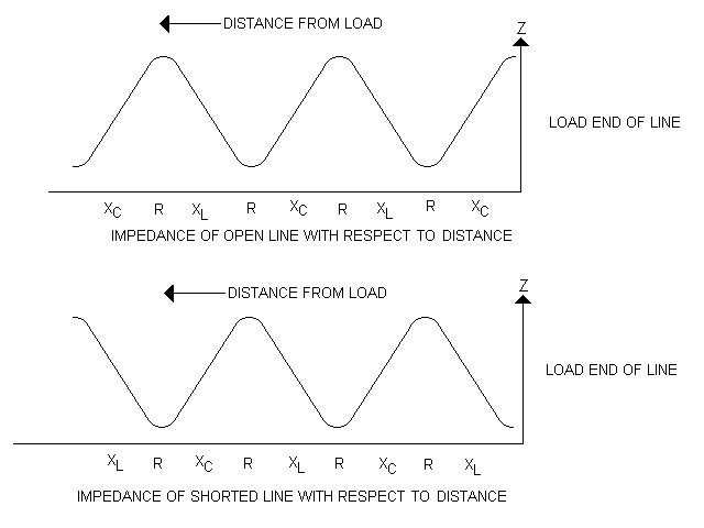Going back to the first image, looking at the waveforms below the circuit we see that standing waves go from maximum to minimum in 1/4 wavelength intervals along the line. The open or short circuited line will present to it's source a high or low impedance at multiples of 1/4 wavelength, depending upon the location of the source in reference to the load (an effect you see when you alter coax lengths). At points that are not an exact 1/4 wavelength multiple from the load or antenna, the line acts as a capacitor or an inductor. Current at the generator will either lead or lag the voltage. An open or short circuited line may assume the characteristics of a resonant circuit formed of lumped component elements of inductance and capacitance.