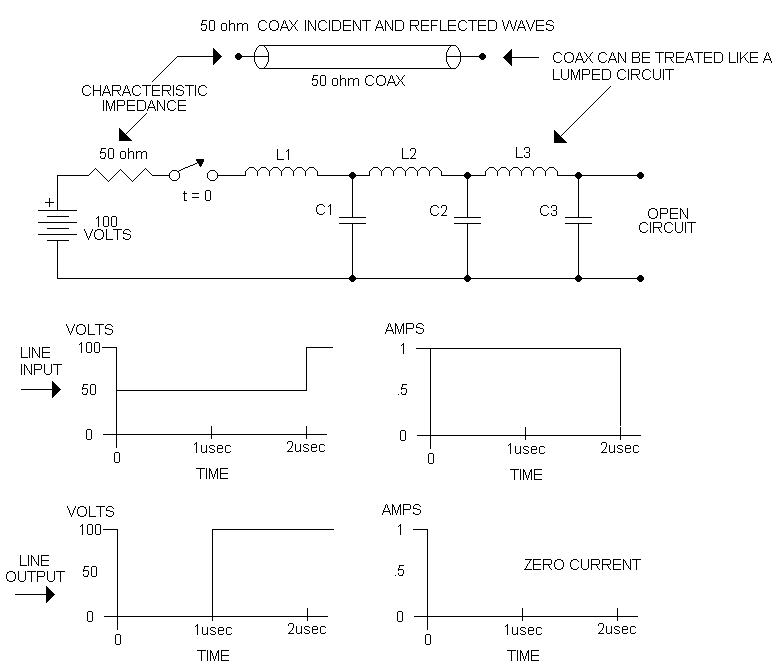OPEN LINE: When the switch is closed at t=0, 1 amp will flow from the 100 volt source, since the 50 ohm resistor is in series with the 50 ohm impedance of the line, (the resistor is added so the applied voltage to the line will be 50 volts). As the capacitors begin to charge one by one, a voltage wave moves down the line, which we call the incident voltage wave. There is also an incident current wave which propagates with the incident voltage wave. In 1 usec when the incident waves reach the end of the line, and C3 is charged to 50 volts by the current through L3, and there is no more coax to charge so the magnetic field around L3 will collapse, and the collapsing field will keep the current flowing in C3 in the same direction, charging C3 to 100 volts. Since the current in L3 is now gone, the current in L2 collapses, and in the same way charges C2 to 100 volts as well. Likewise now L1's field collapse charges C1 to 100 volts, until the voltage all across the line is 100 volts, and current flow in the line is zero. The source at this time (t=2 microseconds) "sees" an open circuit for the line. The capacitors charging from 50 volts to 100 volts from the end of the line toward the source creates a reflected voltage wave traveling toward the source propagating in phase and in the opposite direction of the incident voltage wave. The inductors, discharging from the open circuit toward the source create a reflected current wave propagating out of phase and in the opposite direction of the incident current wave. In the drawing are shown the voltage and current verses time at both the input and output ends of the line.SHORTED LINE: The line charges in the same way as the previous circuit but since the voltage must equal zero in a short circuit, when the incident voltage and current waves reach the short circuit (in 1 usec), the charge on C2 must discharge into L3, producing a current of 2 amps in L3. When the voltage of C2 approaches zero, C1 discharges into L2, producing 2 amps of current in it. This goes on until the entire line is at zero volts. The reflected current wave in this case is in phase with the incident current wave, while the voltage reflection in this case is out of phase with the incident voltage wave. At t=2 usec, the source "sees" a shorted line.