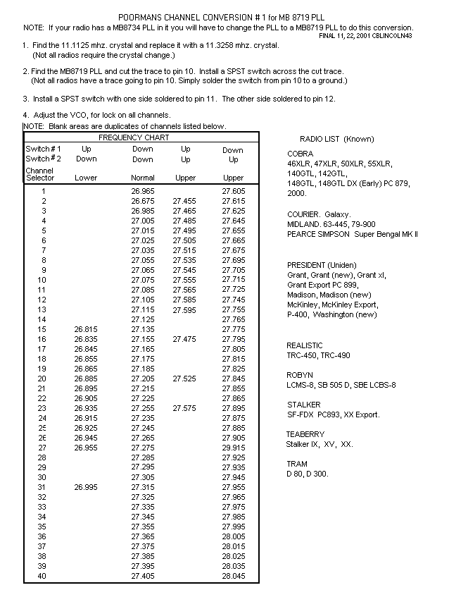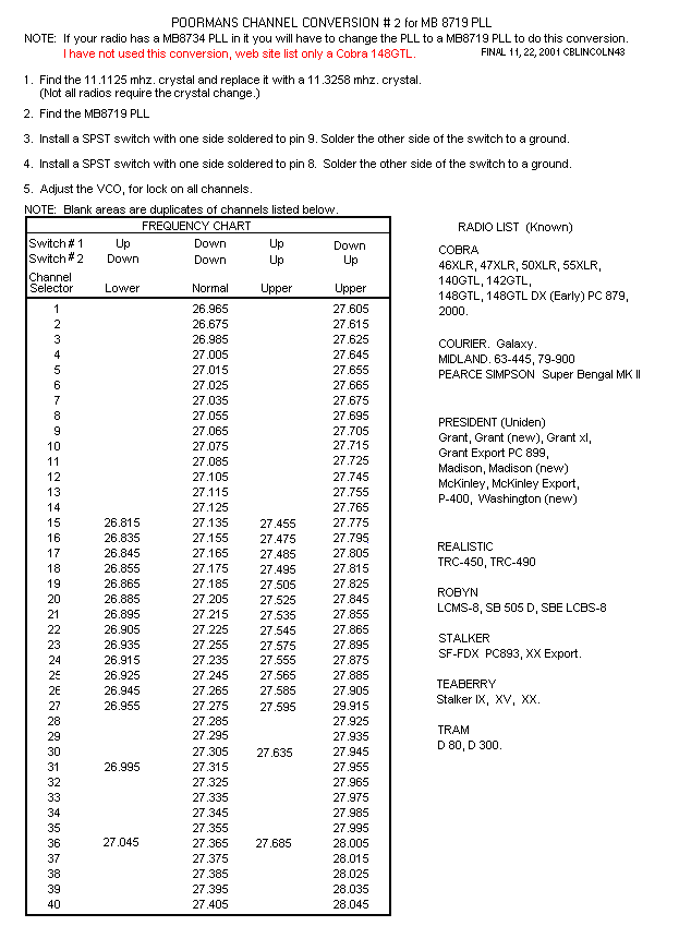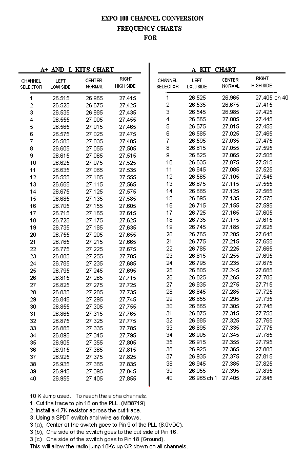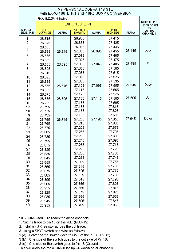 | Cobra 148GTL Expo 100 L Kit Frequency Chart & 10Kc Jump Mod | |