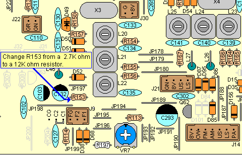 Increase Clarifier Range: Locate resistor R153 on the main pc board (grid location G3). It is right next to connector J9 on the front edge of the main pc board and towards the channel selector. Resistor R153 is a 2.7K ohm and can be change to a 12K ohm resistor for more clarifier range. This will give you about 1.2KHz both up and down. After doing this update perform an PLL alignment as shown below. |